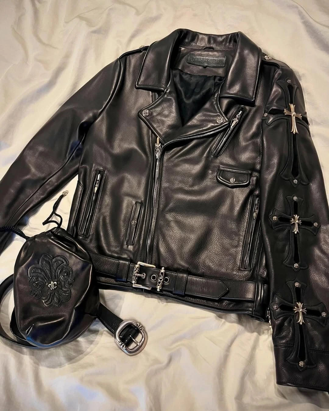 Distinctive Cross Appliqués: Prominent gothic cross details on the back and sleeves.